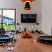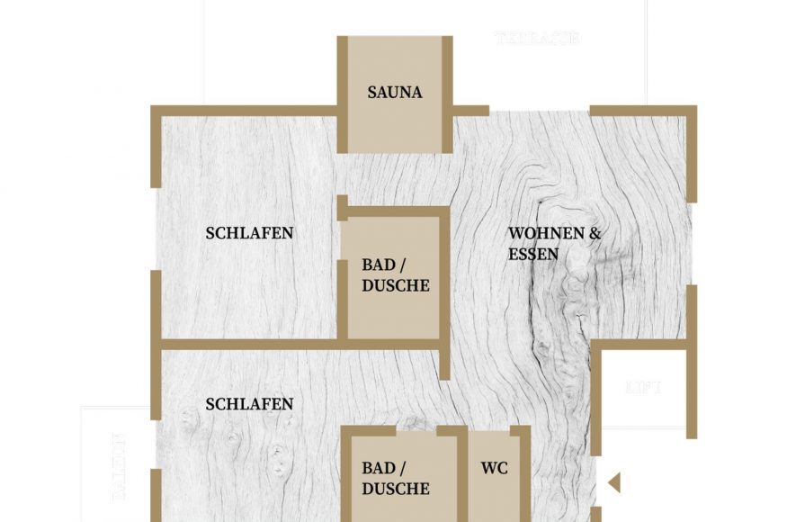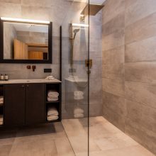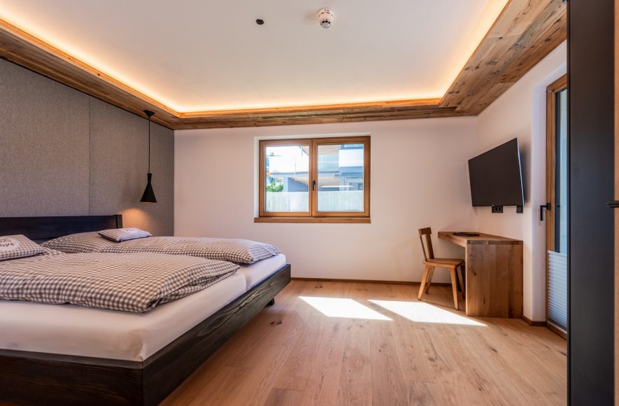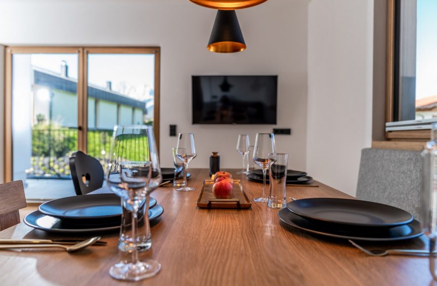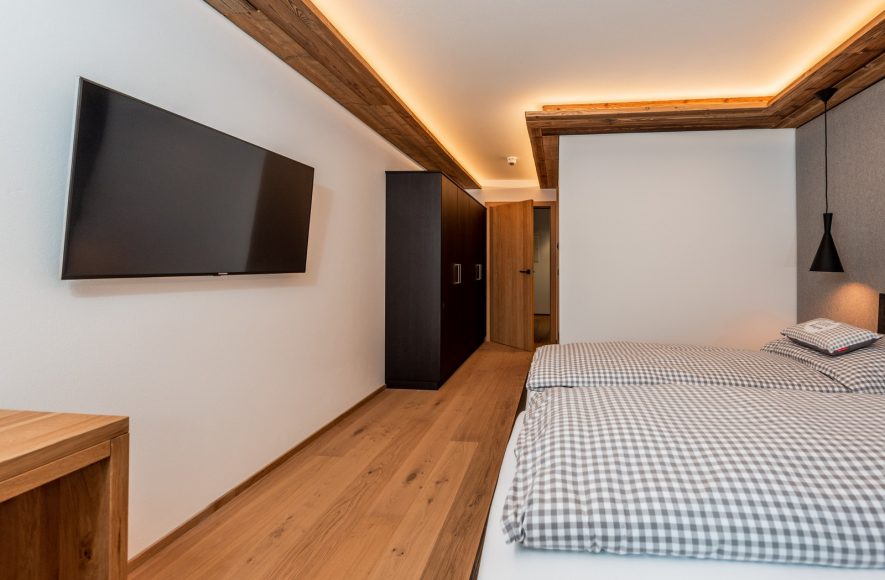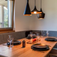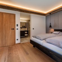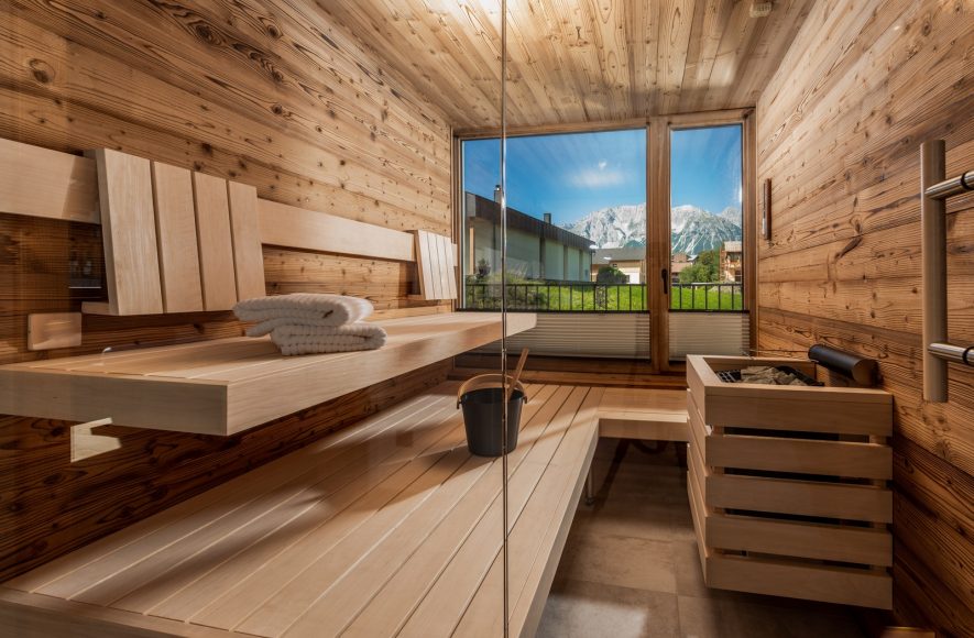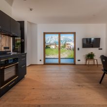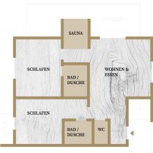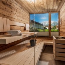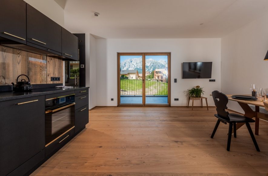 Die Ferienwohnung „Almgräfin“ im ersten Obergeschoß ist sich ihres adeligen Namens sehr bewusst und empfängt mit höchstem Komfort und gediegenem Luxus. Mit der ansprechenden Ausstattung wurde sehr viel Wert auf Behaglichkeit und ein angenehmes Raumkonzept gelegt, das jedem Gast viel Platz zum Entspannen bietet. Die moderne Küche ist komplett ausgestattet und lädt zum Genießen und Beisammensein, die Terrasse sorgt für herrliche Ausblicke und eine Genusszeit im Freien. In die zwei getrennten Schlafzimmer mit jeweils einem Doppelbett wurden regionale Materialien einbezogen, die einen ganz besonderen Charme verbreiten. Die Krönung dieser Ferienwohnung ist die eigene Sauna mit Traumblick auf das Dachsteinmassiv, exklusiv für Ihre ganz persönliche Auszeit.