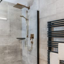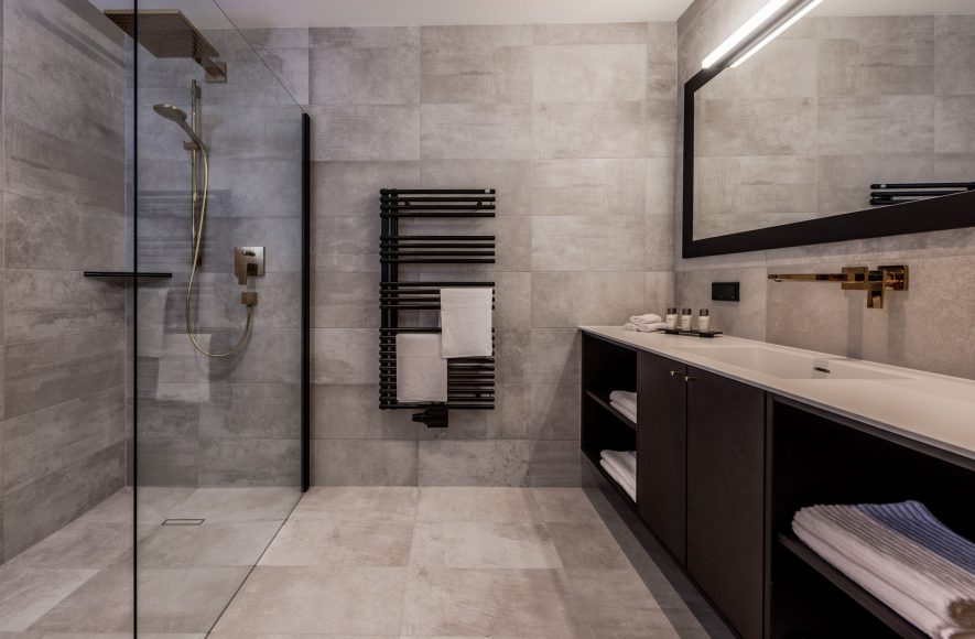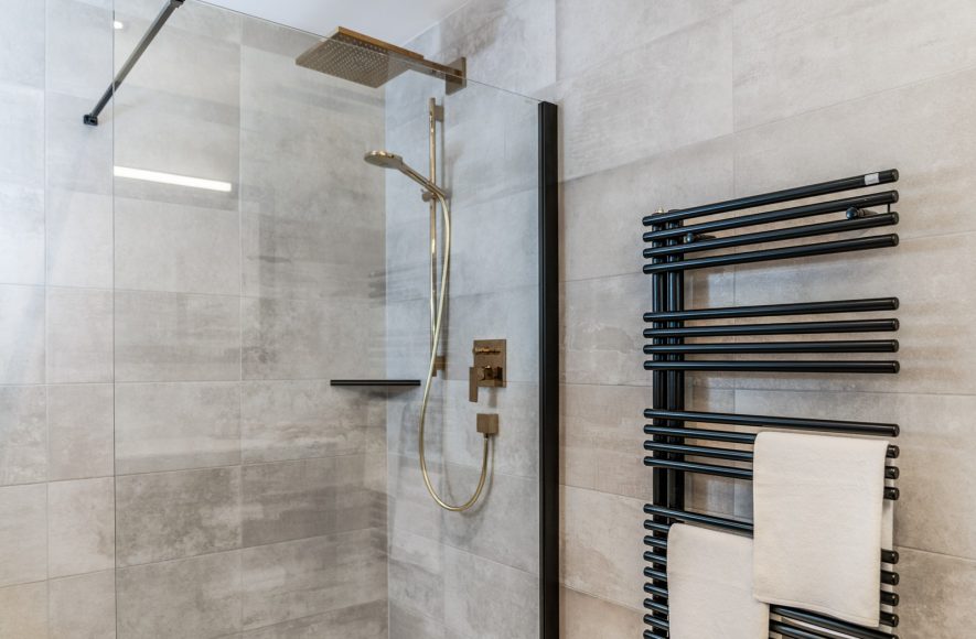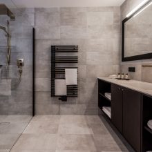 Badezimmer: Geräumige Dusche, Waschbecken mit Unterschrank, Handtuchwärmer, Föhn