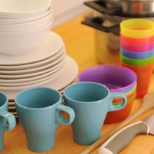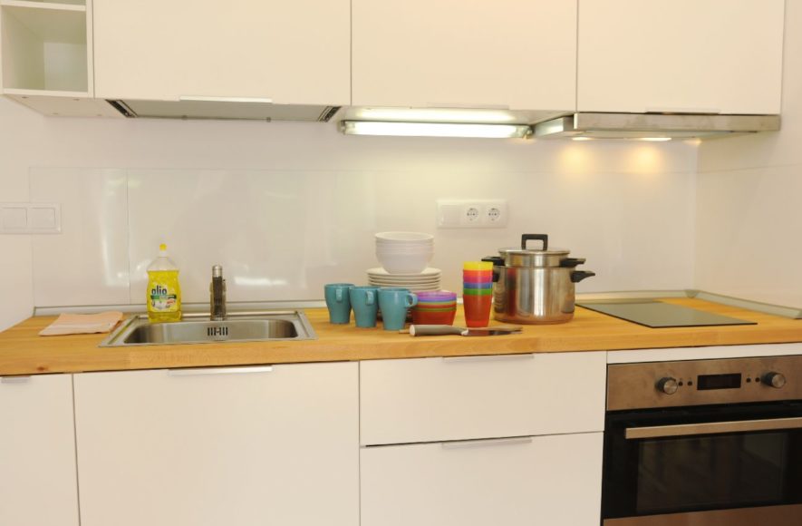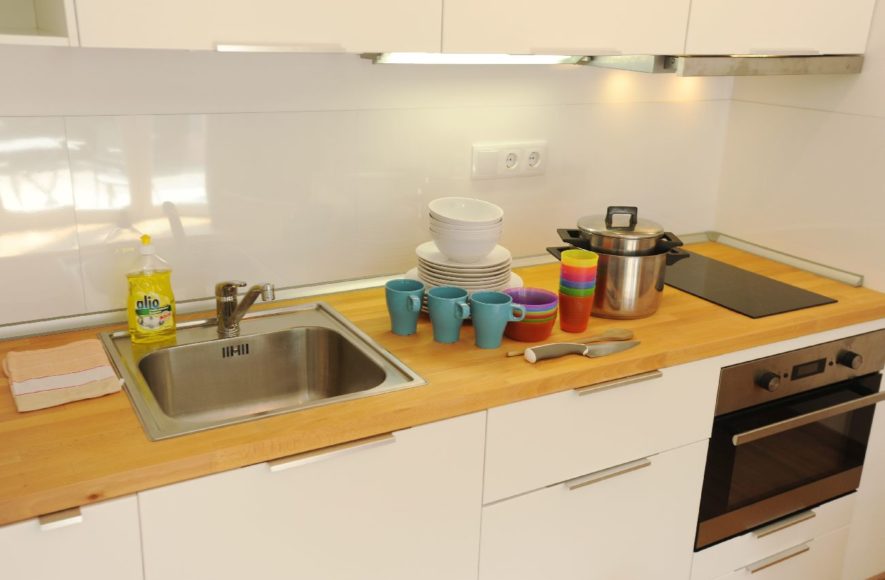 1 Küche - vollausgestattet mit E-Herd, Filterkaffeemaschine, Mikrowelle mit Grill und Umluft, Kühlschrank, Gefrierfach, Geschirrspüler