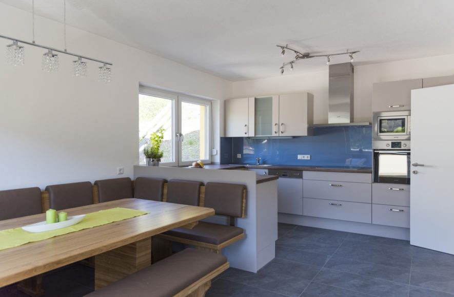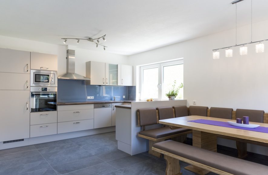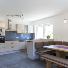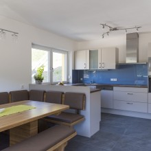 - Küche im großen Wohnraum, vollausgestattet mit Kaffeemaschine, E-Herd, Backofen, Kühlschrank, Gefrierfach, Geschirrspüler