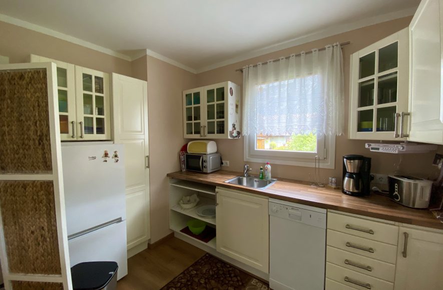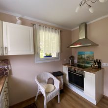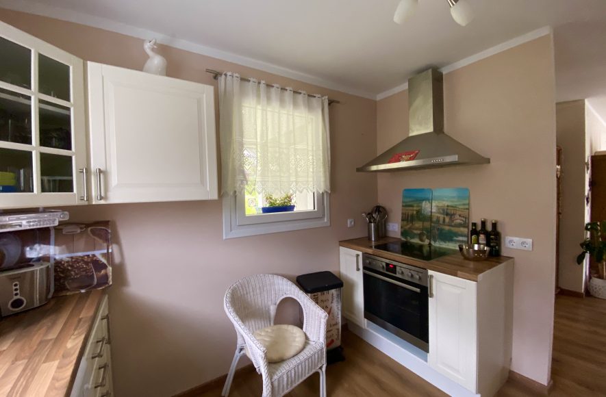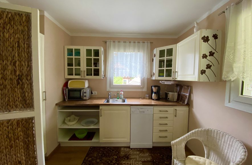 Die Küche ist ausgestattet mit einem E-Herd, Backrohr, Kühlschrank, Geschirrspüler, Kaffeemaschine, Geschirr, Mikrowelle, Wasserkocher.