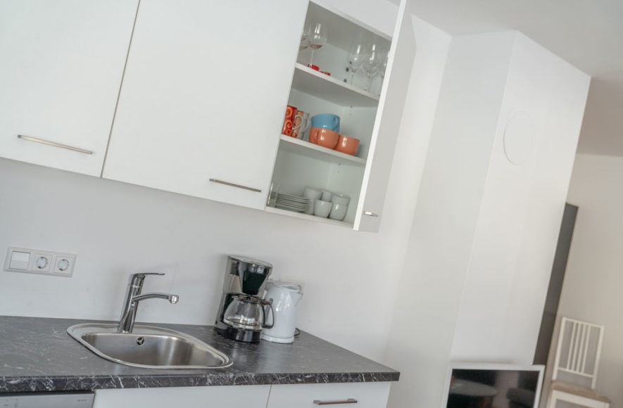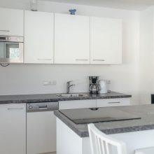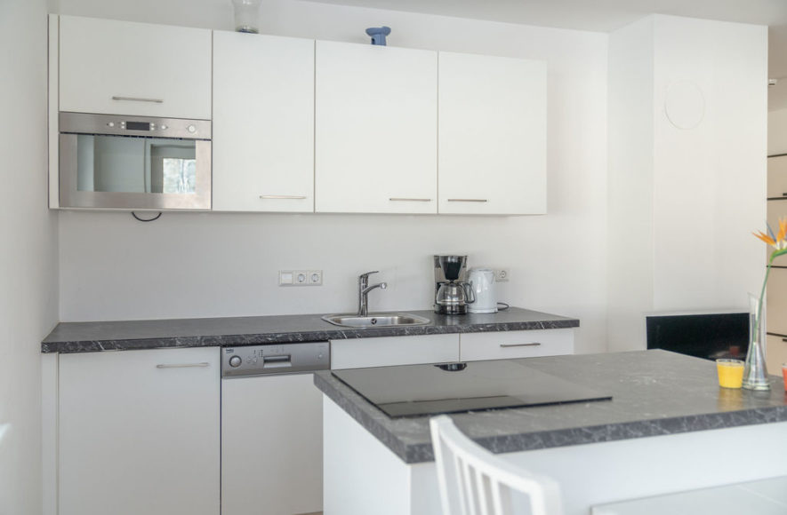 große Wohn-Küche vollausgestattet mit E-Herd, Backofen, Kühlschrank mit Gefrierfach, Mikrowelle, Geschirrspüler, Filter-Kaffeemaschine