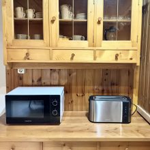 • 1 gut ausgestattete Küche, mit Essecke, Kühlschrank (im Vorraum), Geschirrspüler, Toaster, Microwelle, Herd mit Backrohr, Küchenutensilien,