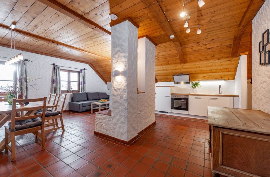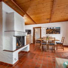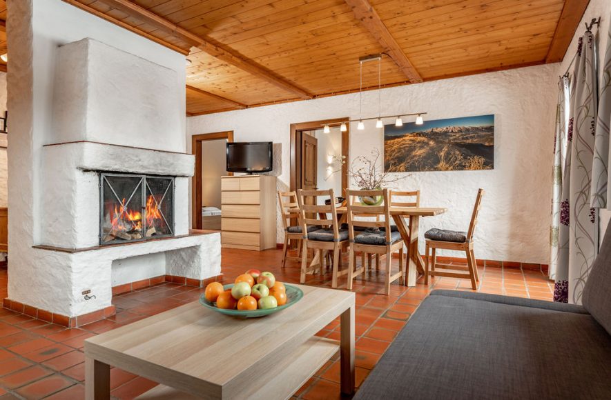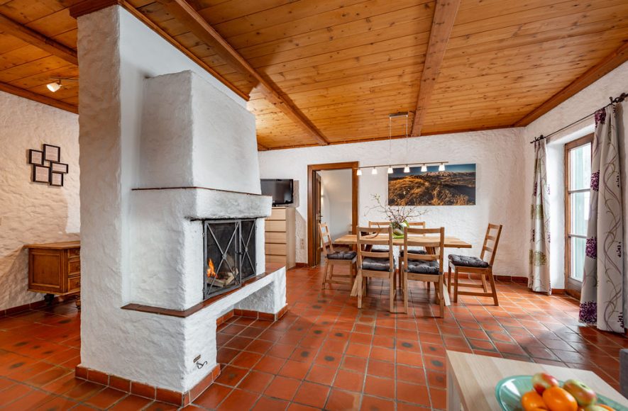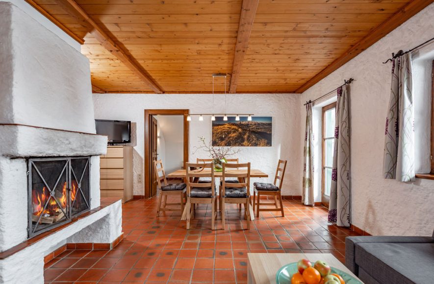1 Wohn-/Esszimmer inklusive Küche, Geschirrspüler, Tisch mit Stühlen, offener Kamin, Couch, TV