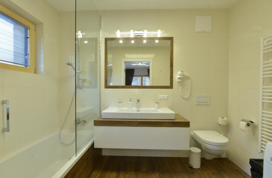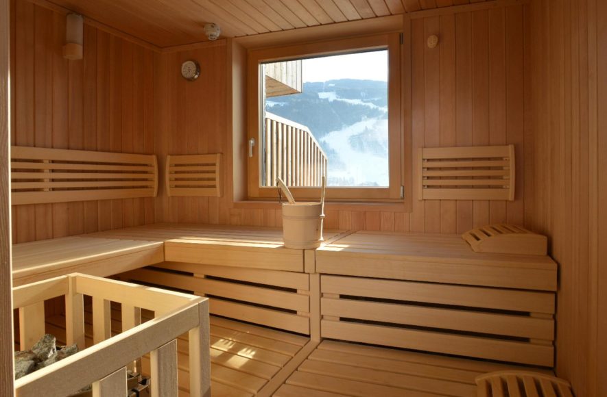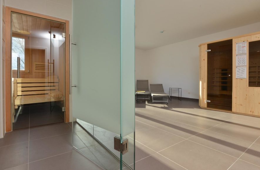 Wellnessbereich mit Sauna, Infrarot, Duschen, WC, Ruheraum und Terrasse im Gartengeschoss