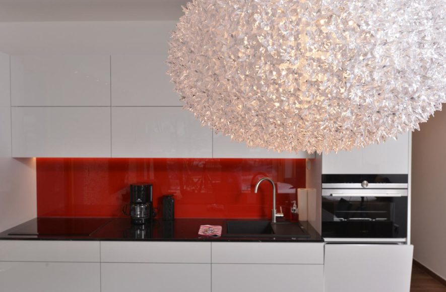 Küche gut ausgestattet mit Kaffeemaschine (Nespresso & Filter), E-Herd, Backofen, Kühlschrank, Gefrierfach, Geschirrspüler