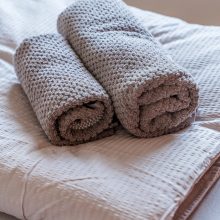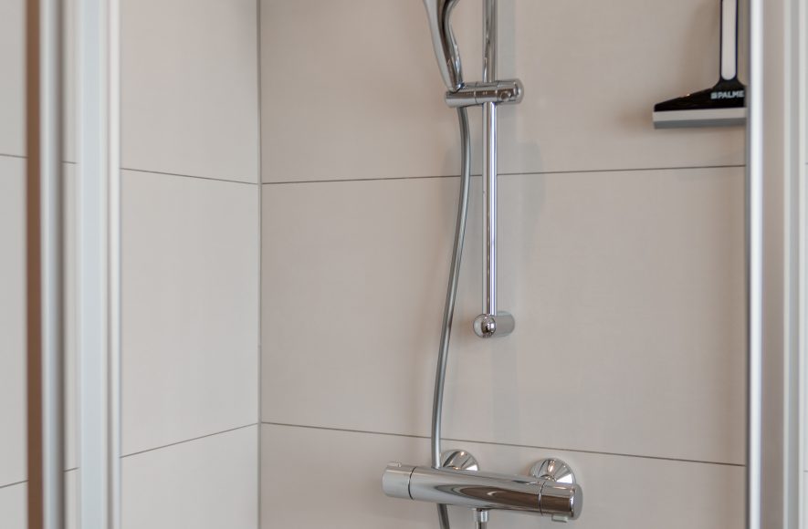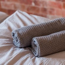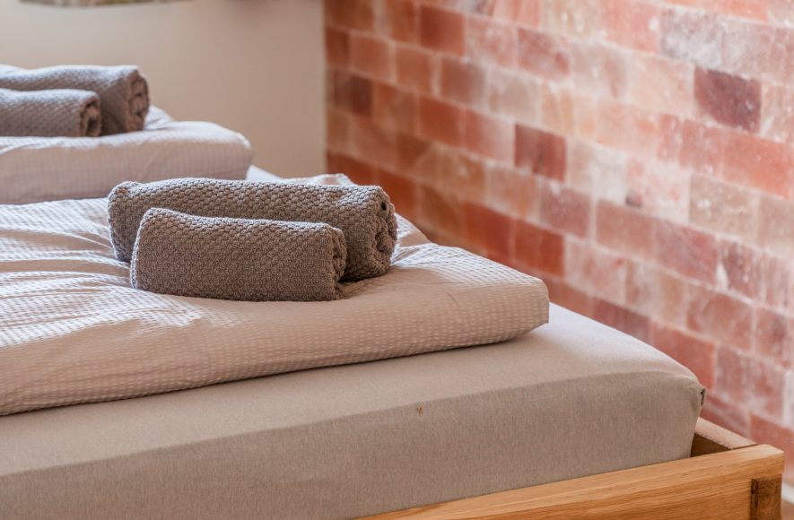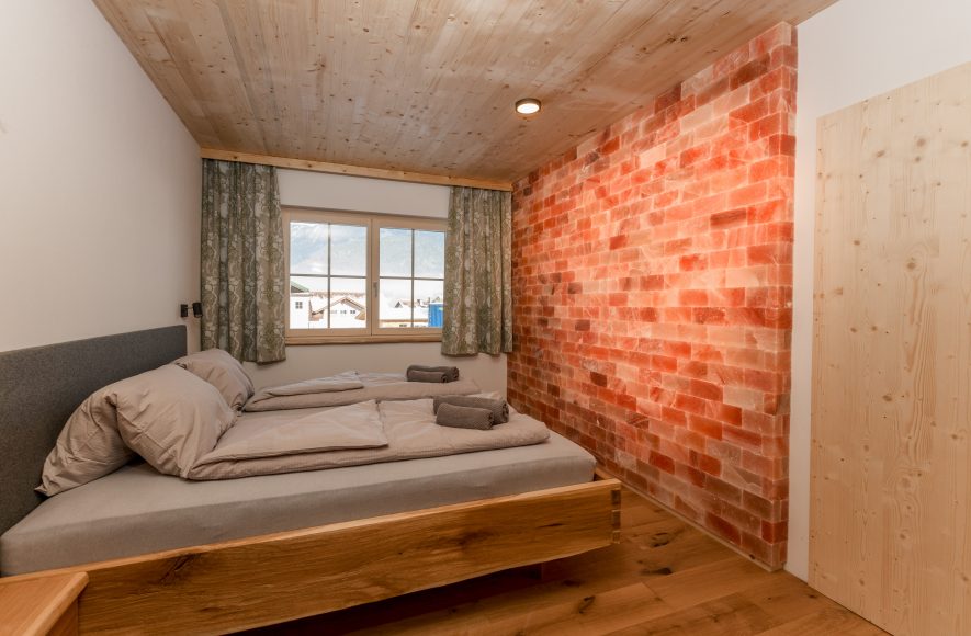 Unser kleines aber feines Appartement besteht aus einem Schlafzimmer mit einem Doppelbett und einer Salzwand