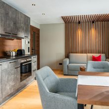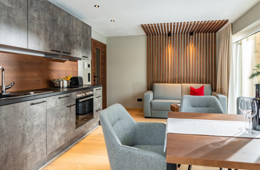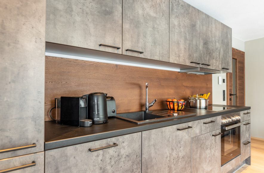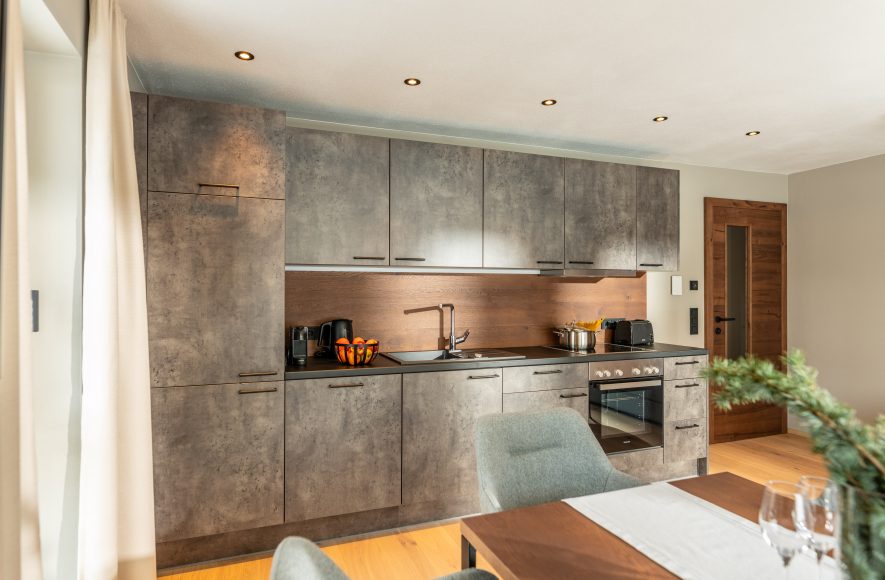Küche ausgestattet mit Kaffeemaschine Nespresso (Kapsel), E-Herd, Backrohr, Geschirrspüler, Kühlschrank mit Gefrierfach, Mikrowelle, Wasserkocher, Toaster