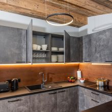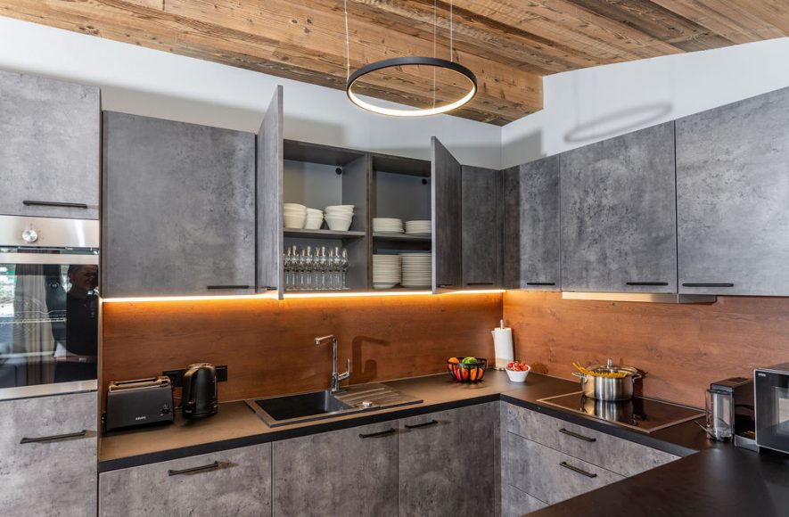 Küche ausgestattet mit Kaffeemaschine Nespresso (Kapsel), E-Herd, Backrohr, Geschirrspüler, Kühlschrank mit Gefrierfach, Mikrowelle, Wasserkocher, Toaster